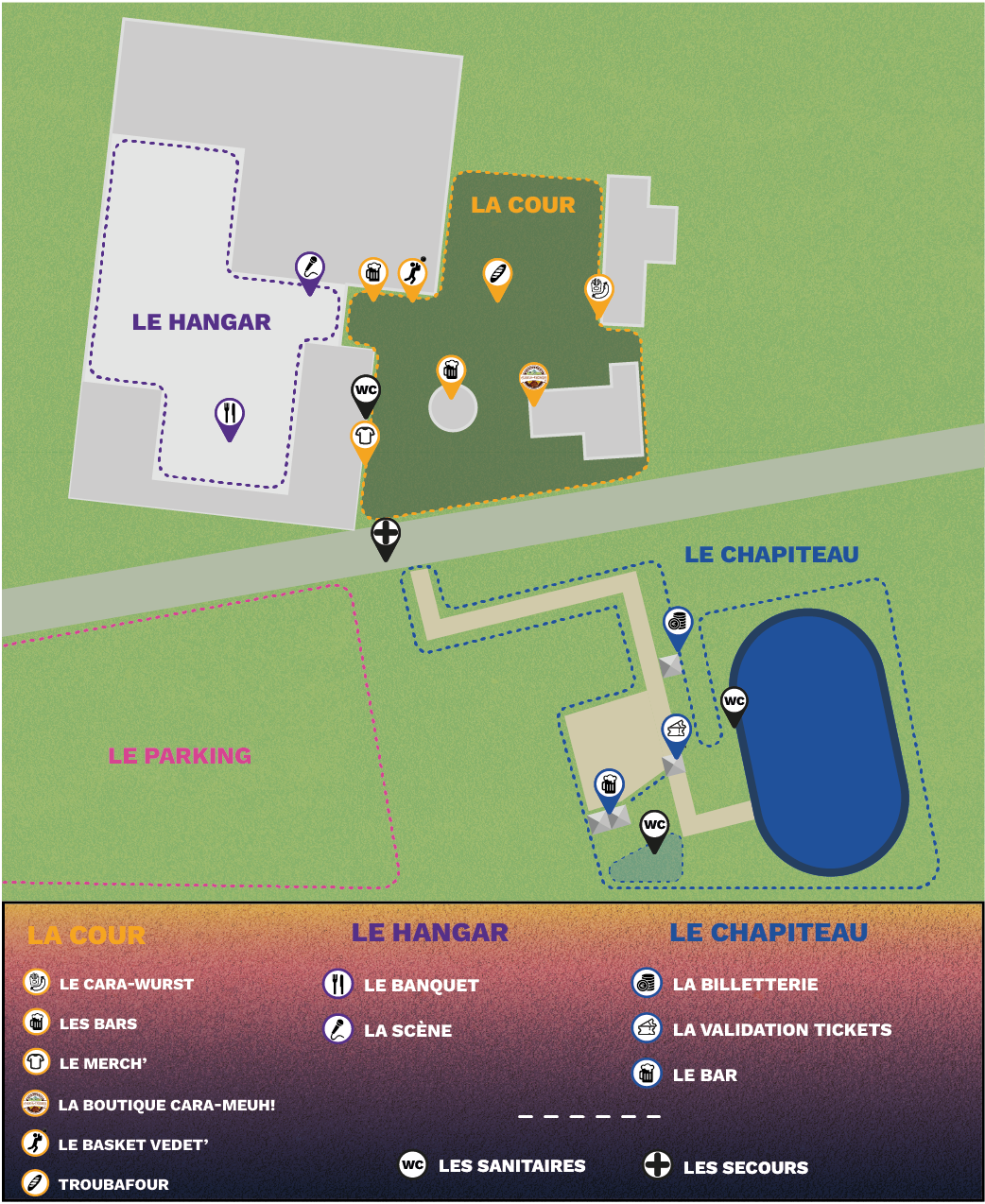 Tous les spectacles se déroulent sous un chapiteau couvert et chauffé, situé devant la ferme. En dehors des spectacles, vous trouverez un espace pour les boissons, des animations, ainsi que le dîner du samedi soir et le déjeuner du dimanche midi dans la cour de la ferme de Cara-Meuh et dans le hangar. Vous aurez toujours un endroit pour vous abriter, mais nous vous conseillons de prévoir une tenue adaptée à la météo.